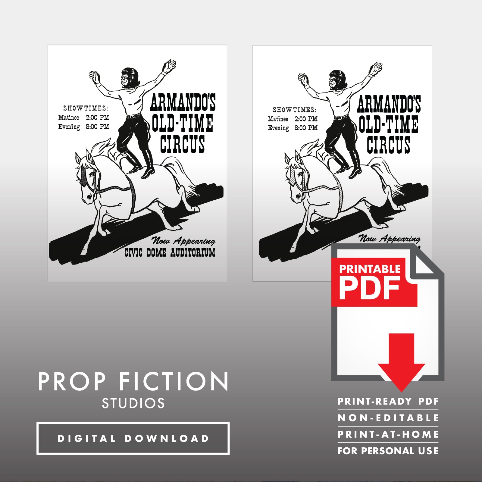 This listing is for a PDF Print-at-Home file/s for download and contains no physical items through the post. These black-and-white printable US Letter PDF files are an ideal and cost-effective way to help build up your prop collection! These digitally remastered print-at-home reproduction flyers/handbills are transferred digitally and available to download link via email upon purchase. This listing is for non-editable digital PDFs containing artwork to help recreate the Armando’s Old-Time Circus handbills featured in the film.