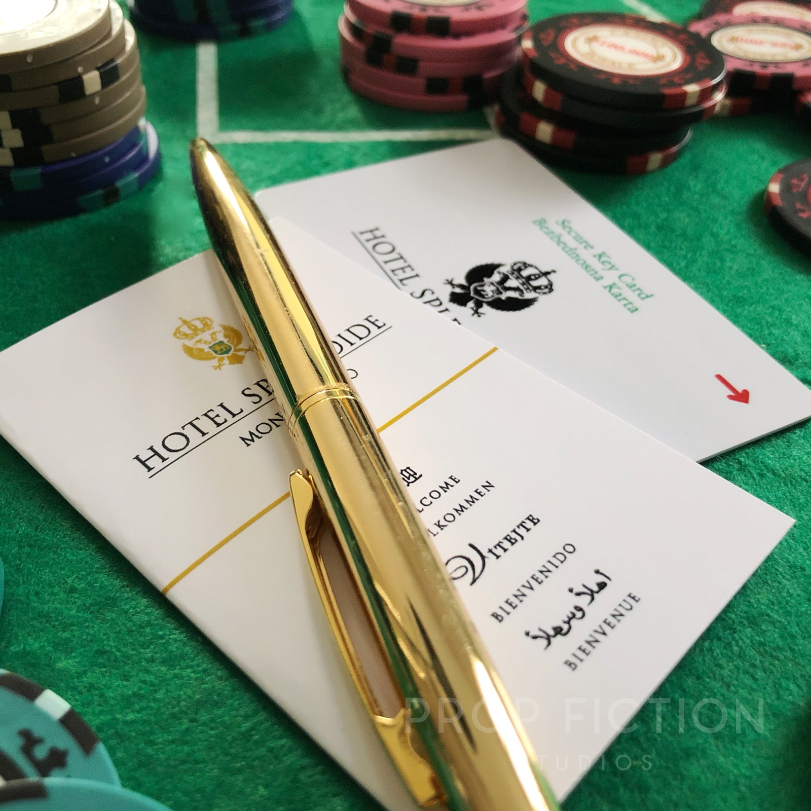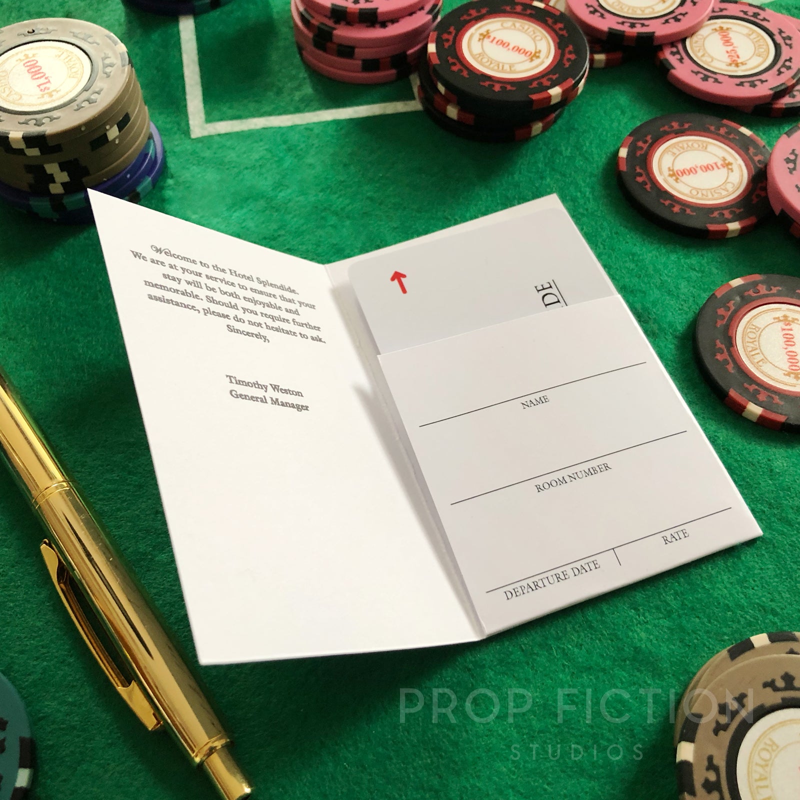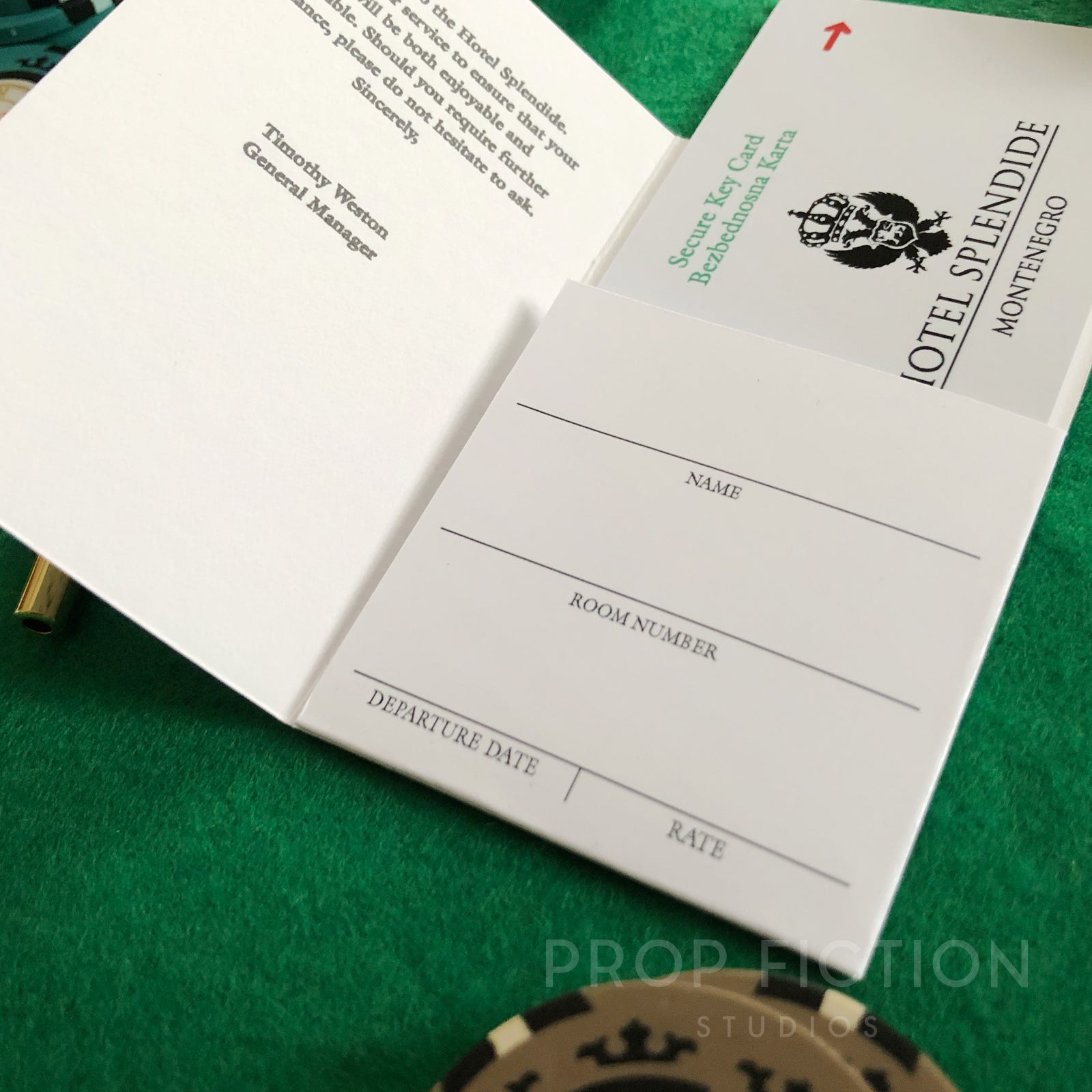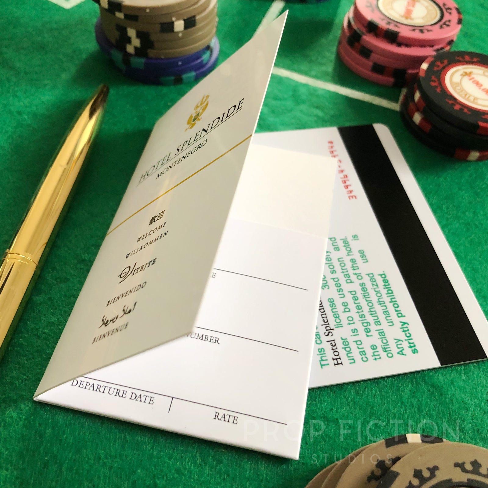 This is a rare opportunity to own this highly sought-after room key card and wallet inspired by Casino Royale, for your stay at the fictional Hotel Splendide. Our reproduction props are professionally printed using the best quality materials. They are created using traditional film and television art department techniques for added authenticity and so are perfect for on-screen or display use.