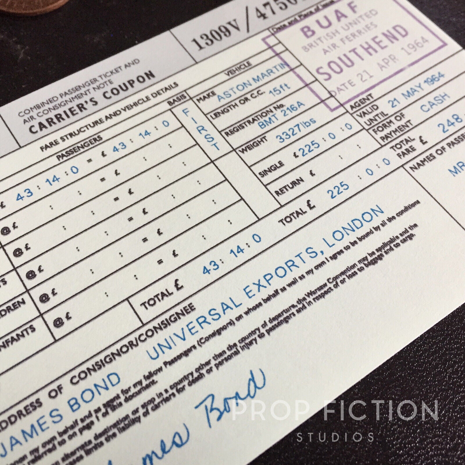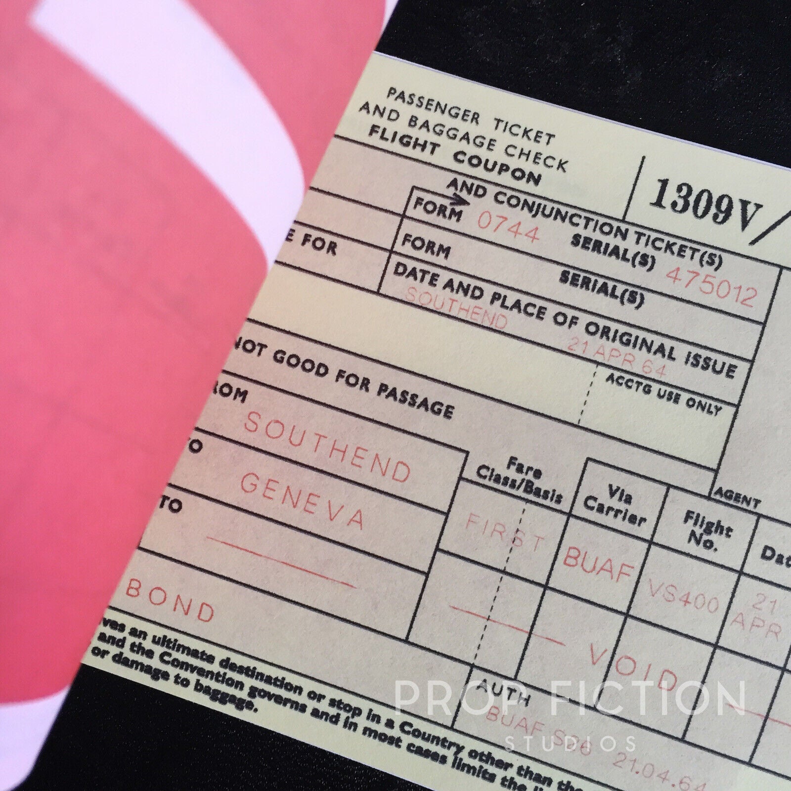 This is a rare opportunity to own this highly sought-after Goldfinger-inspired prop British United Air Ferries airline ticket as would have been used by Bond (and his Aston Martin) to fly to Geneva in pursuit of villain, Goldfinger! This reproduction prop is professionally printed using the best quality materials. It is created using traditional film and television art department techniques for added authenticity and so is perfect for on-screen or display use.
