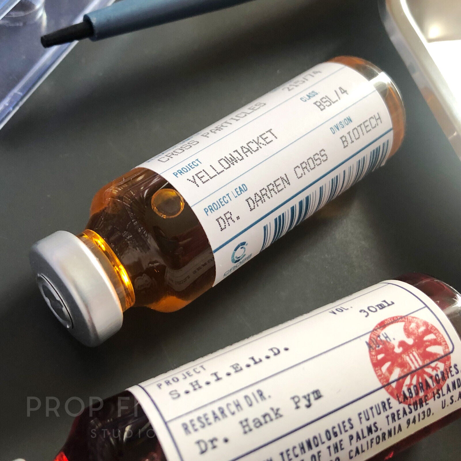 This is a rare opportunity to own these highly sought-after MCU-inspired prop sealed research sample vials based upon the fictional Pym / Cross Particles that power the shrinking and growth technologies of the comic book characters’ suits! These fictional cosplay reproduction props are professionally created using the best quality materials. They are created using traditional film and television art department techniques for added authenticity and so are perfect for on-screen or display use. The vials are available individually, as a Pym Particles pair of vials or as a set of three from the list below: