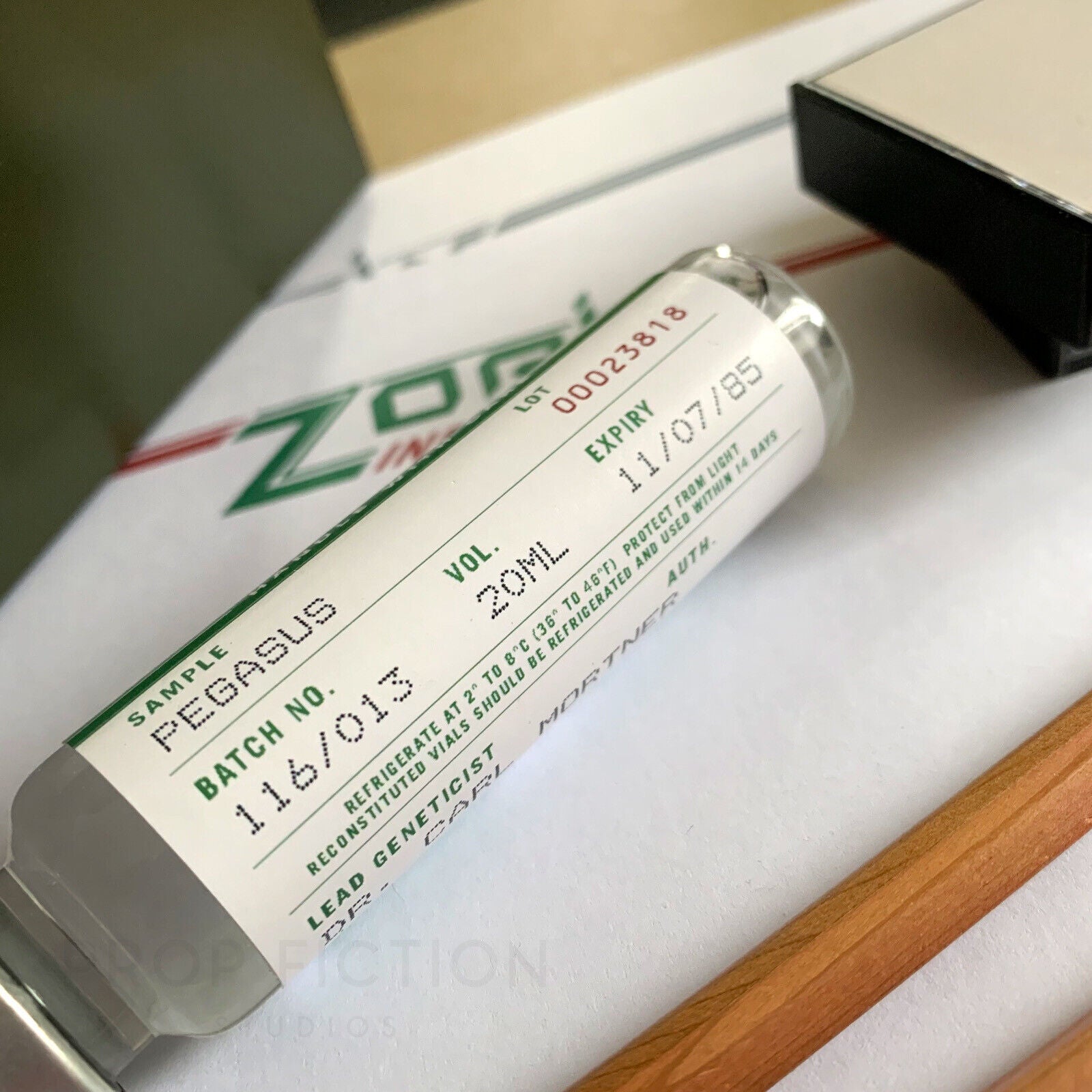 This is a rare opportunity to own this highly sought-after Zorin-inspired fictional prop Pegasus laboratory sample vial! This reproduction prop is professionally created using the best quality materials. It is created using traditional film and television art department techniques for added authenticity and so is perfect for on-screen or display use.