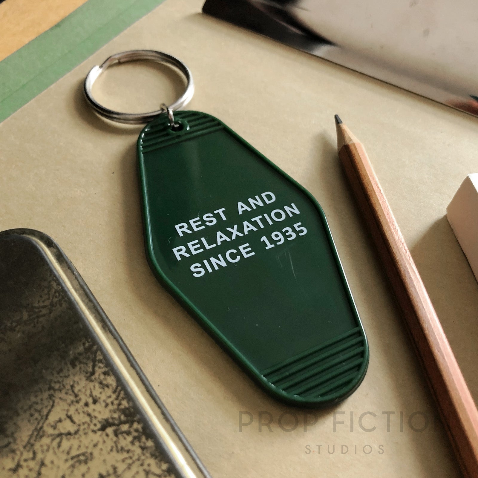 Note: The green printed plastic fob portion of the keyring measures approximately 90mm x 45mm and is similar to the vintage style popularly used by hotels and motels across North America.