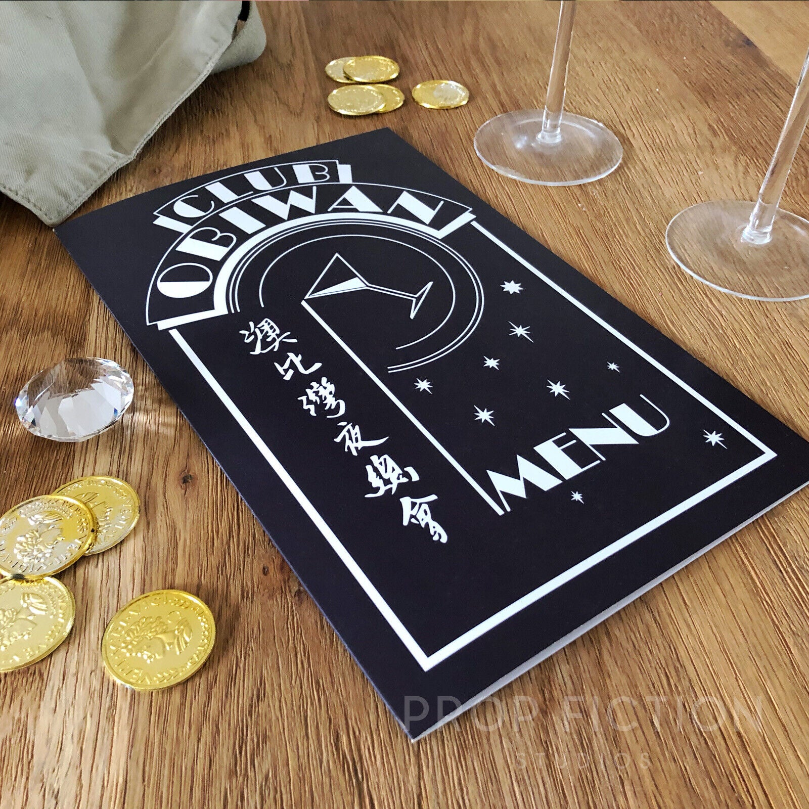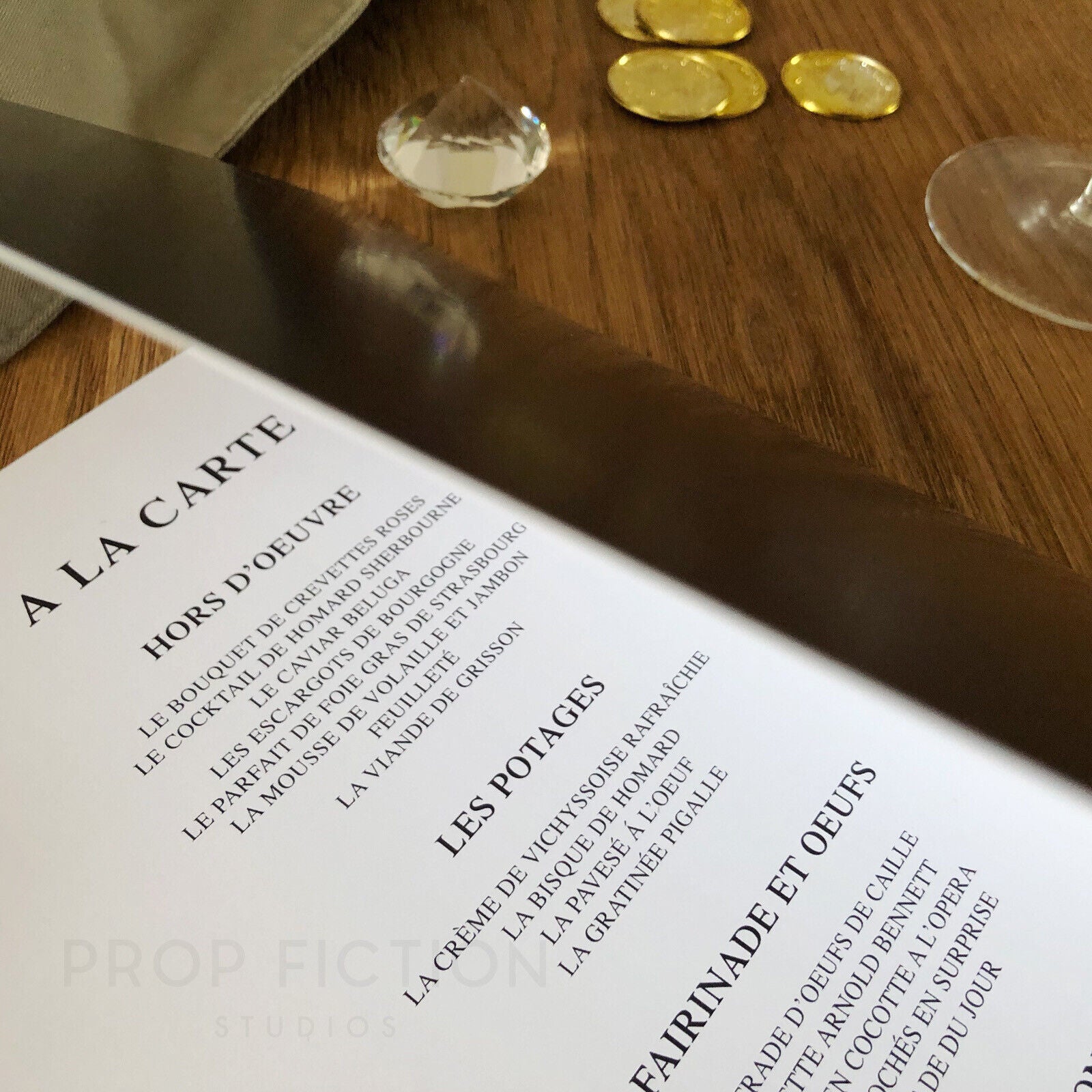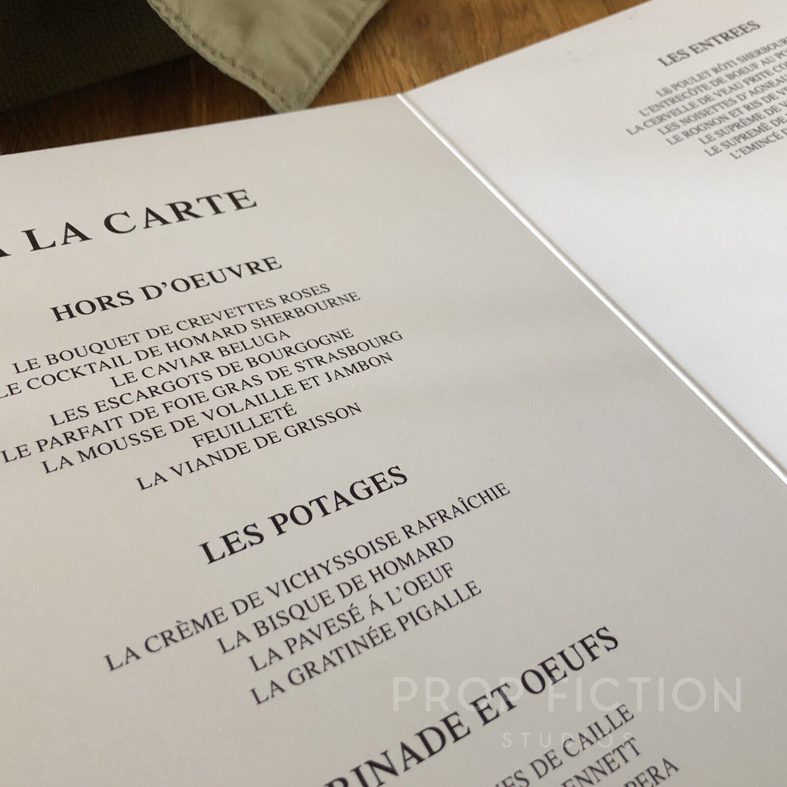 Important Note: The folded menu is created using a heavy cardstock similar to that of real-world menus with a matt satin finish. The menu is based upon those used during the production featuring the club’s logo on the outer front cover and a fancy French-based ‘a la carte’ menu on the inside.