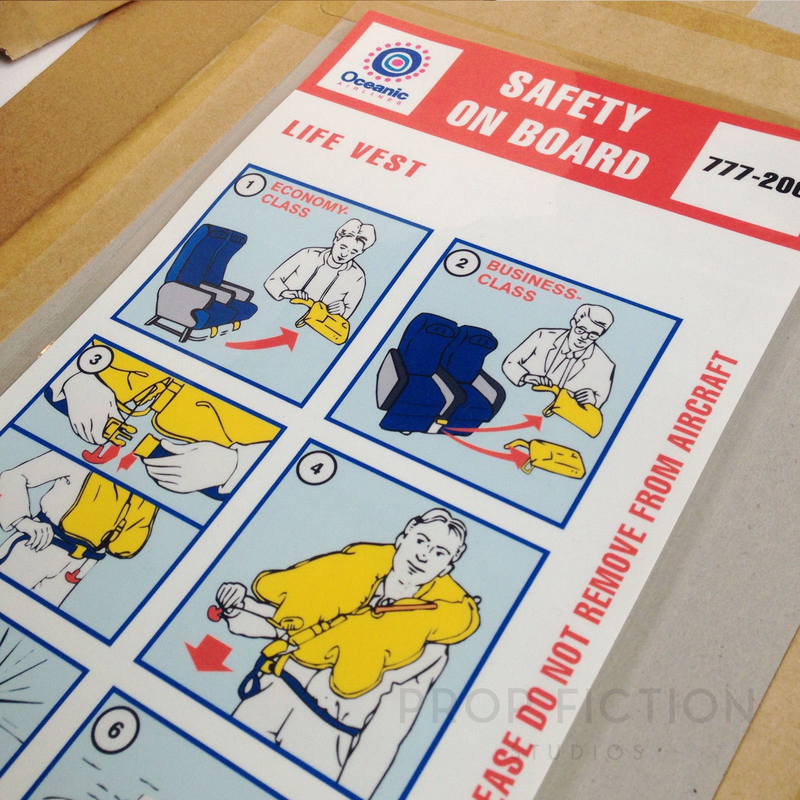 This is a rare opportunity to own this highly sought-after Oceanic Airlines prop on-board aircraft safety card! This double-sided reproduction prop is professionally printed using the best quality materials. It is created using traditional film and television art department techniques for added authenticity and so is perfect for on-screen or display use.