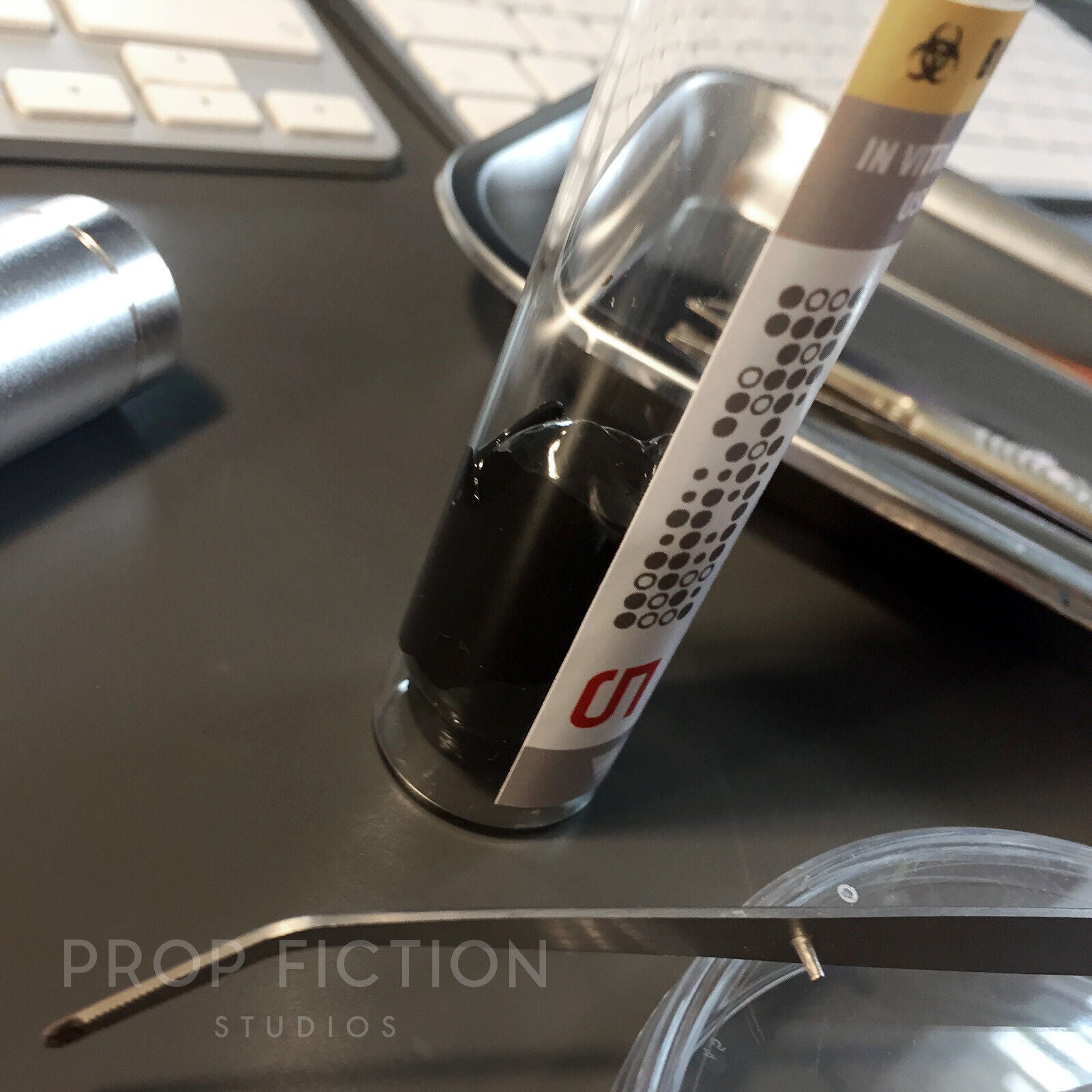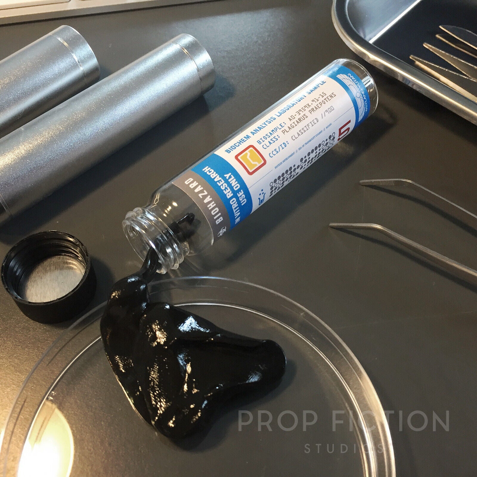 Note: The prop specimen sample glass jars measure approximately 98mm in length. The black clay slime / putty sample contained within the jars can be stretched and reformed but will extremely slowly ooze back to eventually settle back to one single mass. Depending on the orientation of the vial during storage or transit the material may settle differently to the one pictured although we may ship the vial and black sample separately (with the black putty in a airtight ziplock bag so you can get to squish it and shape it before rolling it up and inserting it within the vial ready for display.)