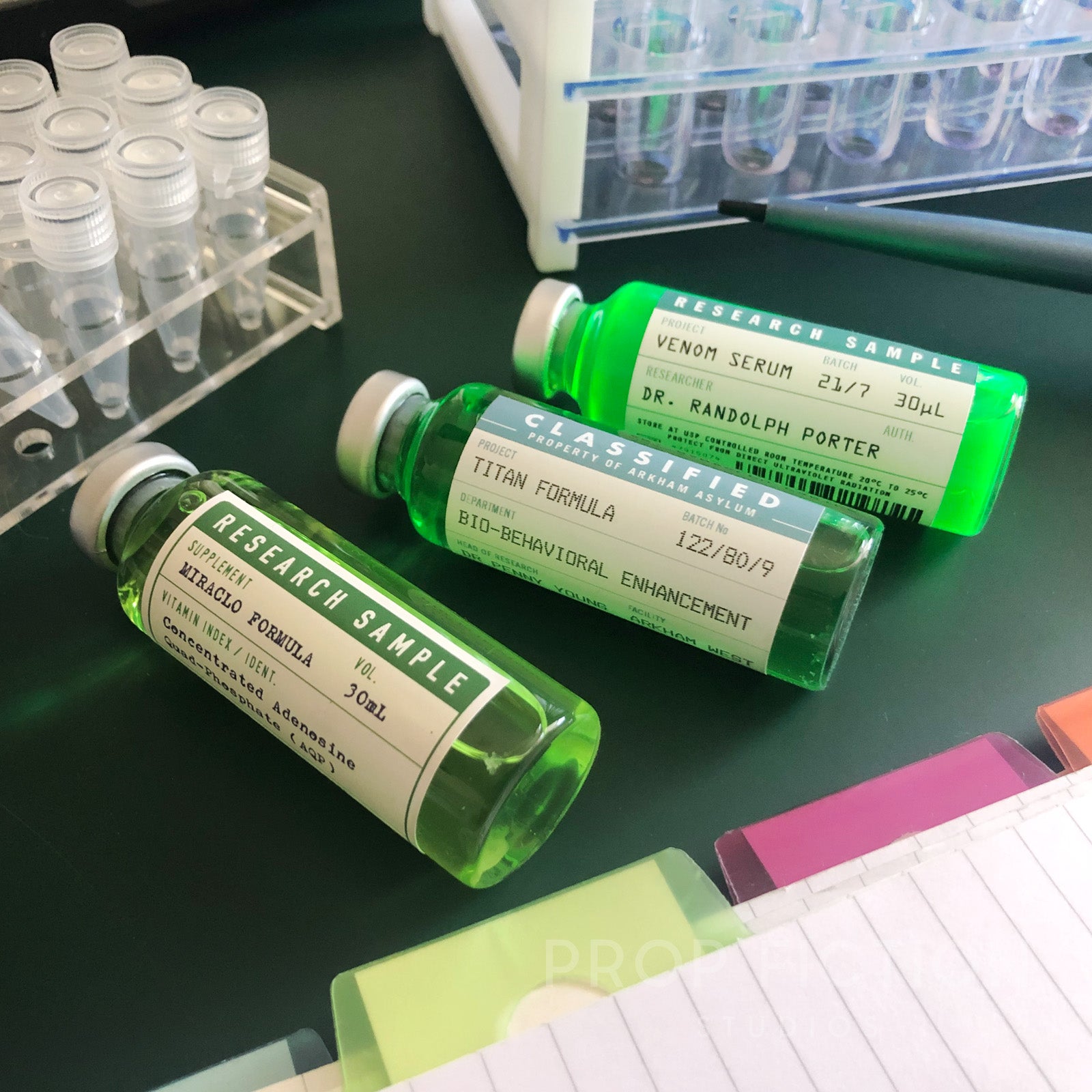 This is a rare opportunity to own these highly sought-after MCU-inspired prop sealed research sample vials based upon the fictional MiracIo Formula, Titan Formula and Bane’s Venom Serum! These fictional cosplay reproduction props are professionally created using the best quality materials. They are created using traditional film and television art department techniques for added authenticity and so are perfect for on-screen or display use. The vials are available individually or as a set of three from the list below: