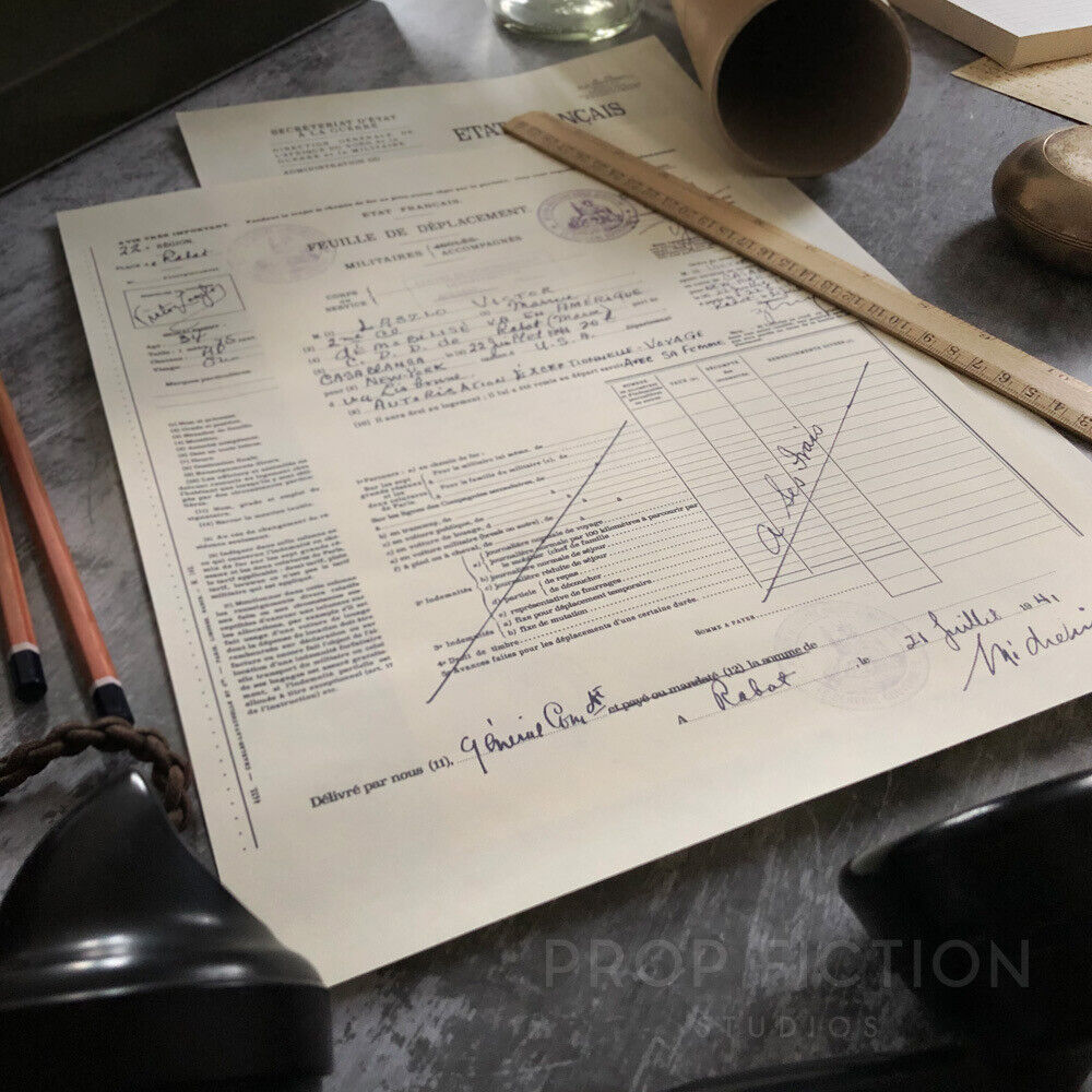 This is a rare opportunity to own this pair of highly sought-after prop Casablanca-inspired papers. The creation of these ‘Letters of Transit’ were the result of a museum exhibition as well as collector requests. These reproduction props are professionally created using the best quality materials. They are created using traditional film and television art department techniques for added authenticity and so are perfect for on-screen or display use. This auction for a pair of documents as pictured includes: