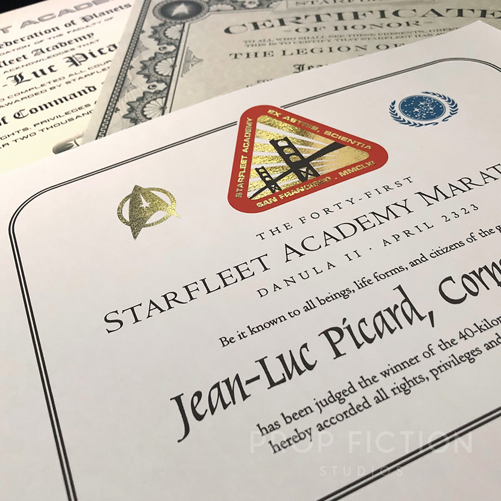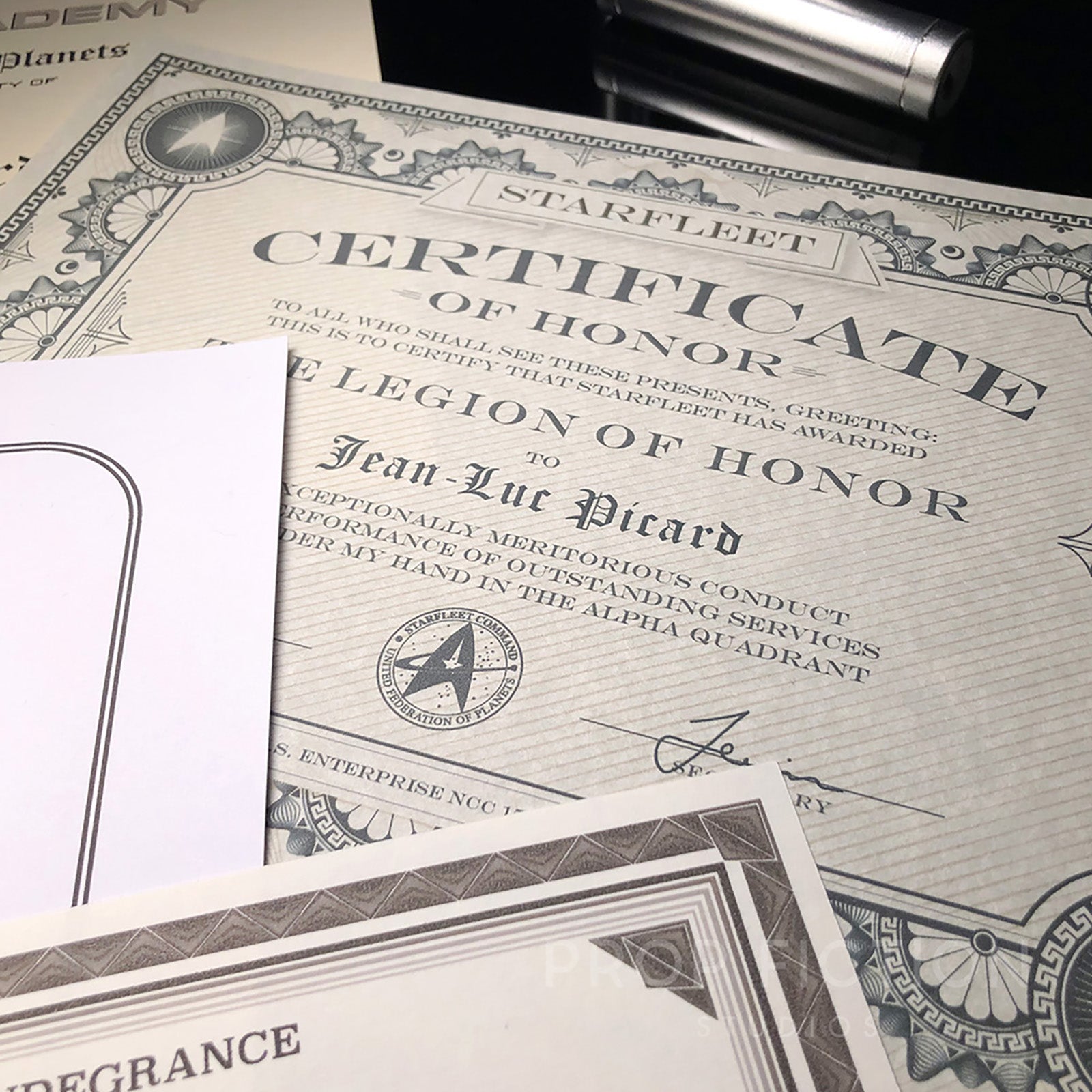 This is a rare opportunity to own these highly sought-after prop certificates inspired by the fictional Starfleet Academy and awarded to Jean-Luc Picard. These reproduction props are professionally printed using the best quality materials. They are created using traditional film and television art department techniques for added authenticity and so are perfect for on-screen, cosplay gathering or display use. The set of four certificates includes: