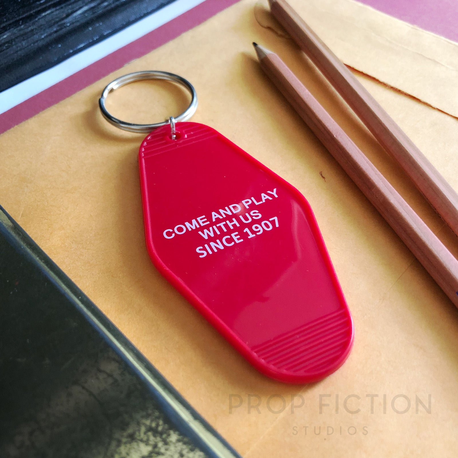Note: The red printed plastic fob portion of the keyring measures approximately 90mm x 45mm and is similar to the vintage style popularly used by hotels and motels across North America. Due to tolerances of the production machines used during fabrication the text may differ in size and placement to the fob pictured.